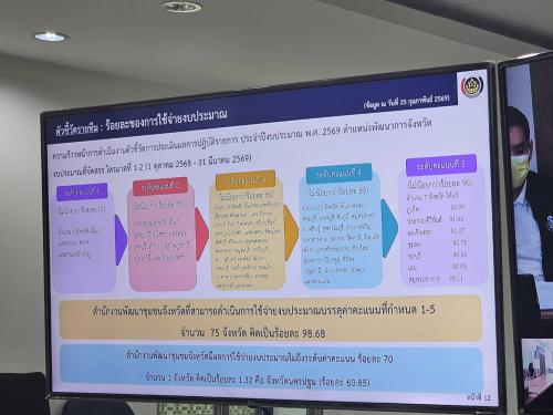 - การติดตามตัวชี้วัดภาพรวมสำนักงานพัฒนาชุมชนจังหวัด : มีการนำระบบประมวลผลเพื่อวิเคราะห์หน่วยงานที่มีผลการดำเนินงานยังไม่เป็นไปตามเป้าหมาย โดยการประชุมครั้งนี้จึงเป็นการสื่อสารโดยตรงไปยังสำนักงานพัฒนาชุมชนจังหวัดทั้ง 76 จังหวัดให้เร่งดำเนินการและแก้ไขปัญหาให้ทันท่วงทีก่อนสิ้นสุดรอบการประเมินในเดือนมีนาคม 2569